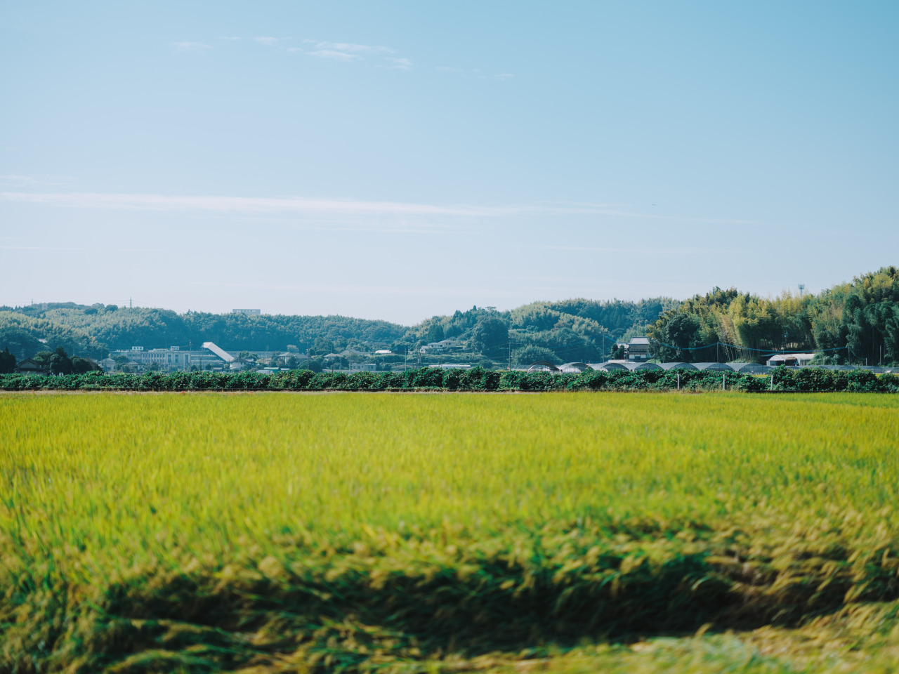 熊本市の中心部から国道3号線を車で北上することおよそ20分。街を抜け、大通りから少し入ると風にそよぐ稲穂の景色が広がります。田畑の近くには、このエリアの特産品であるすいかやメロンを育てるビニールハウスと家々が並び、豊かな田園風景を眺めることができます。