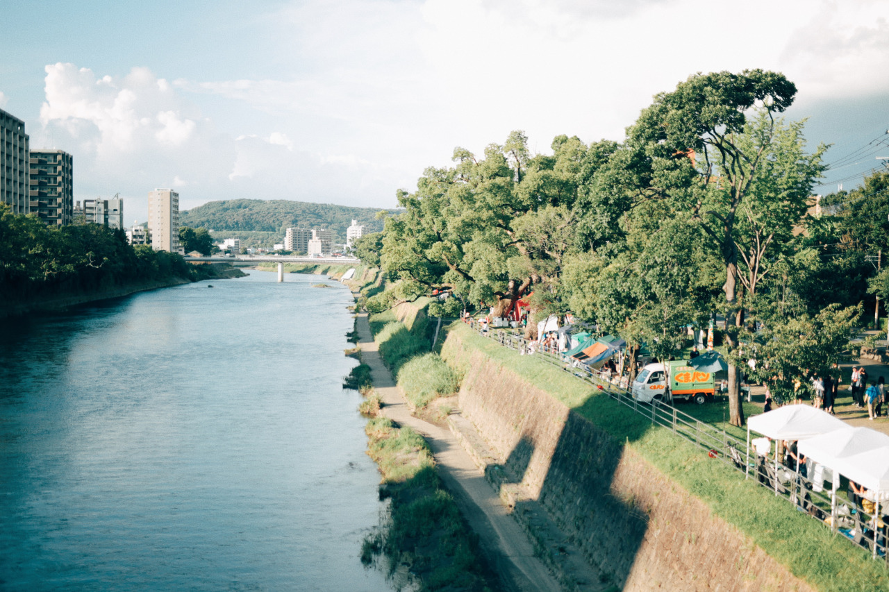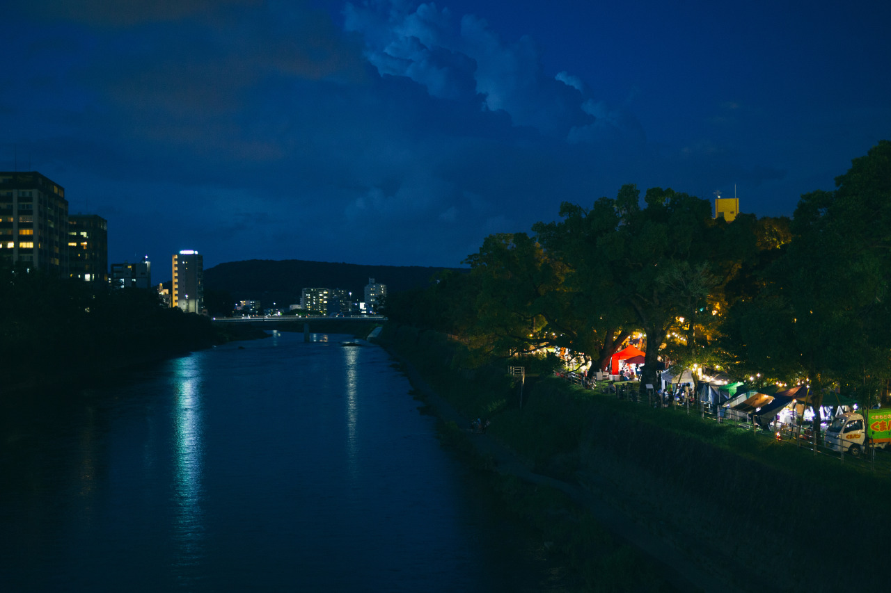 ここ熊本市には「白川」という大きな川が流れています。阿蘇から熊本市の中心部を通って有明海まで流れる一級河川です。街なかから健軍方面に歩いていくと現れる白川に架かる大きな橋「大甲橋」を渡れば、白川「緑の区間」が見えてきます。ここでは定期的に『白川夜市』というお祭りが開催されています。