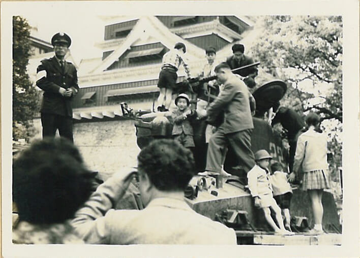 「この写真は、天守閣再建(1960年)を記念して1962年に開かれた『躍進熊本大博覧会』の思い出ですね。なんと天守閣前に戦車が運び込まれたんです。今では考えられませんが(笑)。中央の子どもが私です。城内が遊園地さながらの光景になって、ワクワクしたのを覚えていますね。」