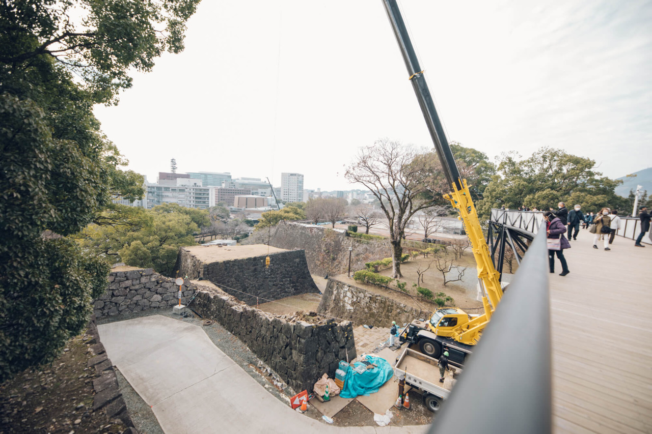 その中でこだわったのが、特別見学通路。熊本城の復旧が完了したら解体してしまうものですが、仮設ではなくきちんとした通路を造りました。『公開しながら復旧する』ことの価値を作り出してくれる一番のポイントです。『文化財ってこういう風に復旧していくんだ』『石垣の仕組みってこうなっているんだ』、そんなことを知りながら、今しか観ることができない熊本城の姿を楽しんでいただきたいですね。」