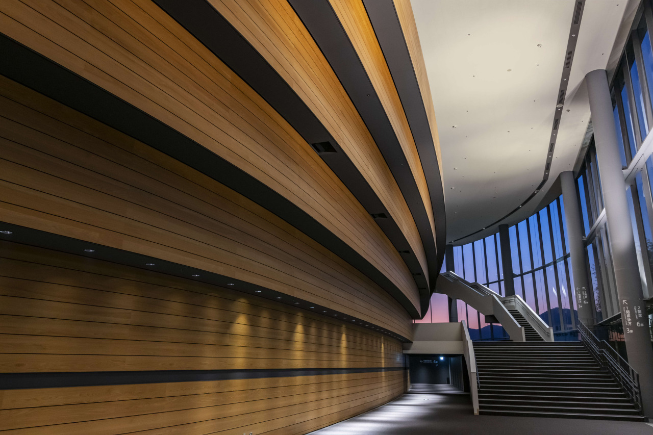 4〜6階の「メインホール」は、約2,300人を収容できる大きなホール。福岡サンパレスと同程度の規模を誇る、九州最大級のホールです。全体がすり鉢状になっており、ホール後方に吹き抜けを作ることにより音がこもらない設計になっているのだそう。壁には県産の杉が使われています。