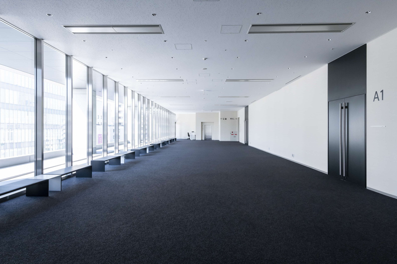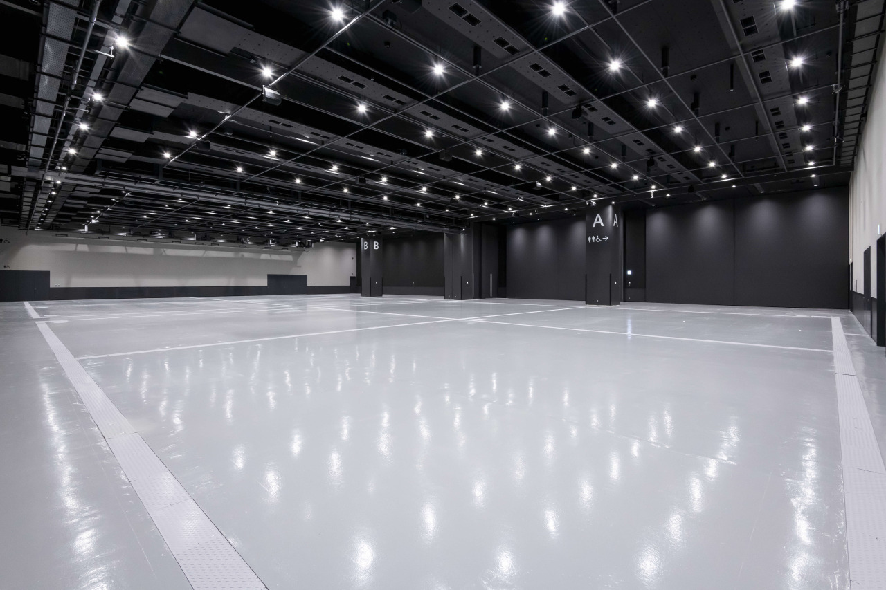 1階の展示ホールは、約1,600平方メートルもの広さを誇ります。重量物にも耐えられる床で天井は高く、商談会やスポーツイベントやモーターショーなども行うことができるキャパシティ。無彩色なので、イベントの雰囲気に合わせてコーディネートすることも可能です。