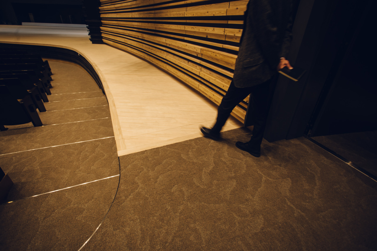 前の人と重ならない座席の配置になっているのもポイントです。また、ステージへの動線がフラットであったり、車椅子席を多く配置することができたりと、ユニバーサルデザインにもこだわっています。