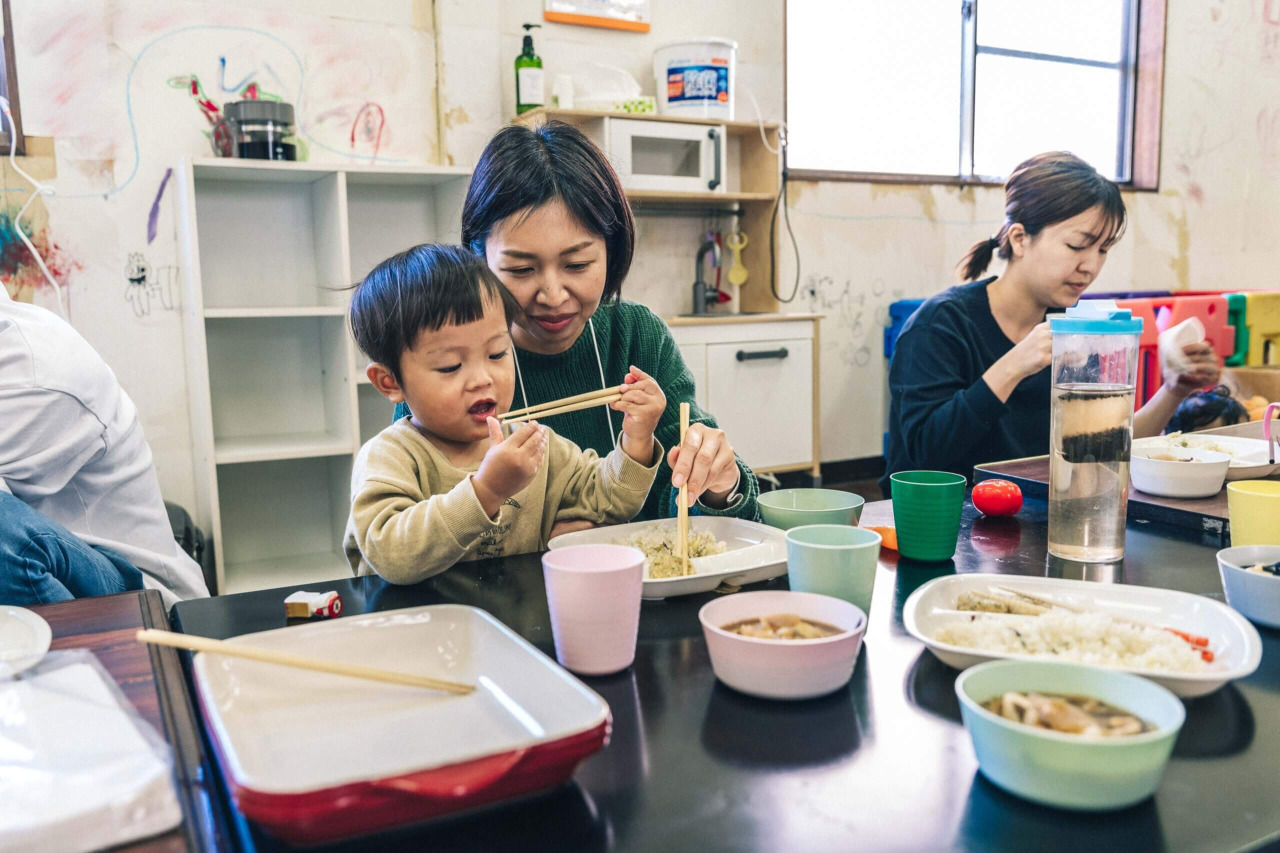 「縁側moyai」の活動内容は、食育や季節行事をテーマにしたイベントや農業体験、ママたちの口コミサイトの運営など多岐にわたります。取材した日は、予約不要で誰でも立ち寄れるイベント「きてきて」が開催中で、ママたちがこどもを子守りし合いながら、熊本の郷土料理「だご汁」を味わっていました。