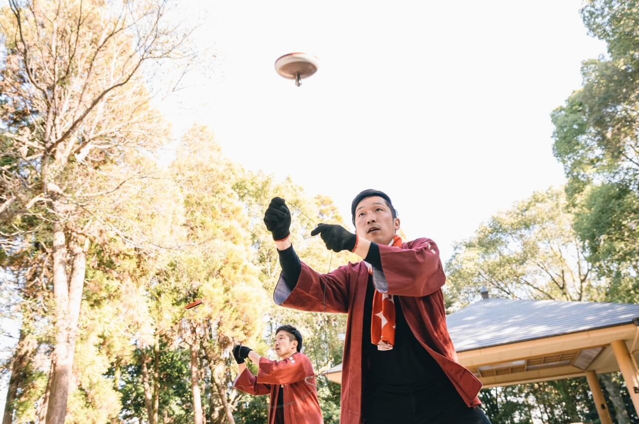 こどもの頃、祖父に教えてもらった「肥後ちょんかけごま」。この郷土芸能を残すだけでなく、若い世代へと広めていきたいと思っています。これも、スポーツイベントの考え方と同じです。どうやれば光るかを考えて、アクロバティックなパフォーマンス性を高めていろんな場で披露しています。動画サイトやテレビなどで度々話題にしていただき、ありがたい限りです。